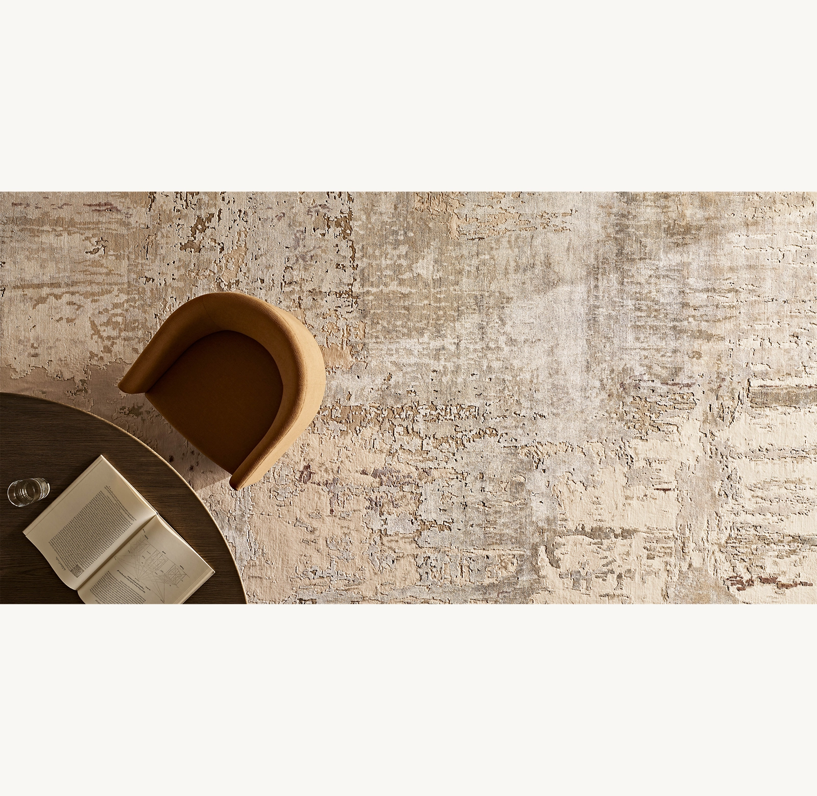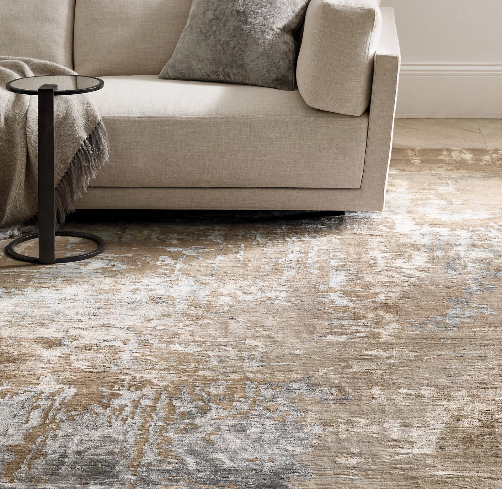 Marbella – Inspired by the elegance of marble, with a luxurious touch. Masterfully crafted in wool and jute, Marbella's flowing patterns and serene hues echo the natural veining of marble. Hand-spun yarns enhance its organic charm and lend a soft, textural elegance to the sheared pile.