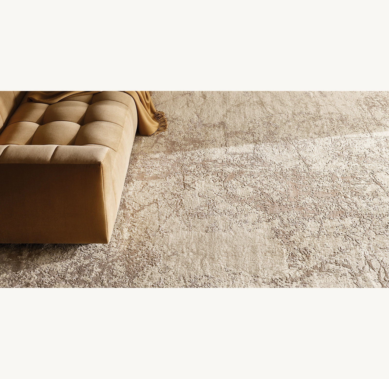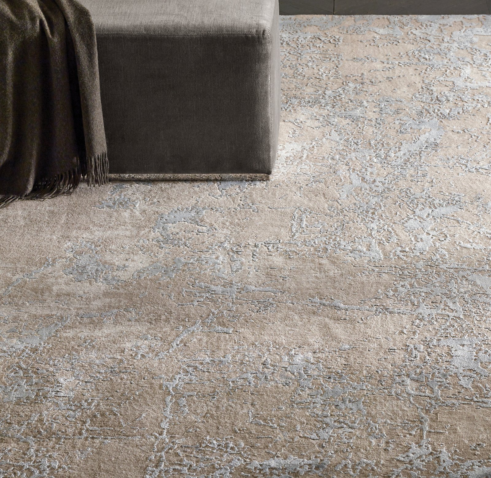 Marbella – Inspired by the elegance of marble, with a luxurious touch. Masterfully crafted in wool and jute, Marbella's flowing patterns and serene hues echo the natural veining of marble. Hand-spun yarns enhance its organic charm and lend a soft, textural elegance to the sheared pile.