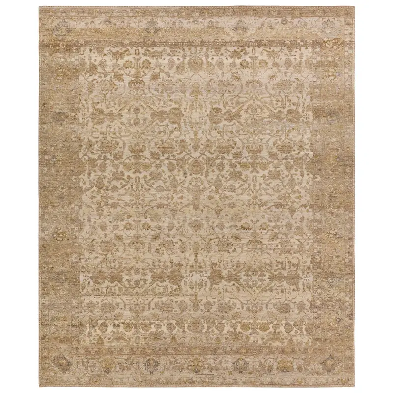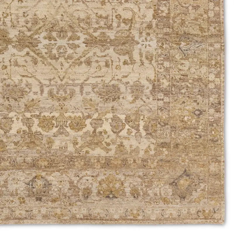 The handknotted Mihret collection gathers inspiration from traditional patterns that offer elegance and a refined, modern colorway. Expertly handcrafted in India with 64 knots per square inch for unparalleled quality, the Zeniba design features traditional floral and scrolling details and a thick border. The tan, gray, and cream colorway, and intentional distressing establishes an updated traditional style. Naturally stain-resistant, the 100% cut wool pile is easy to care for and withstands high traffic areas of the home, children, and pets. Obtaining both a Nest Seal and RugMark certification, this global area rug brings ethical, handmade luxury to the home.