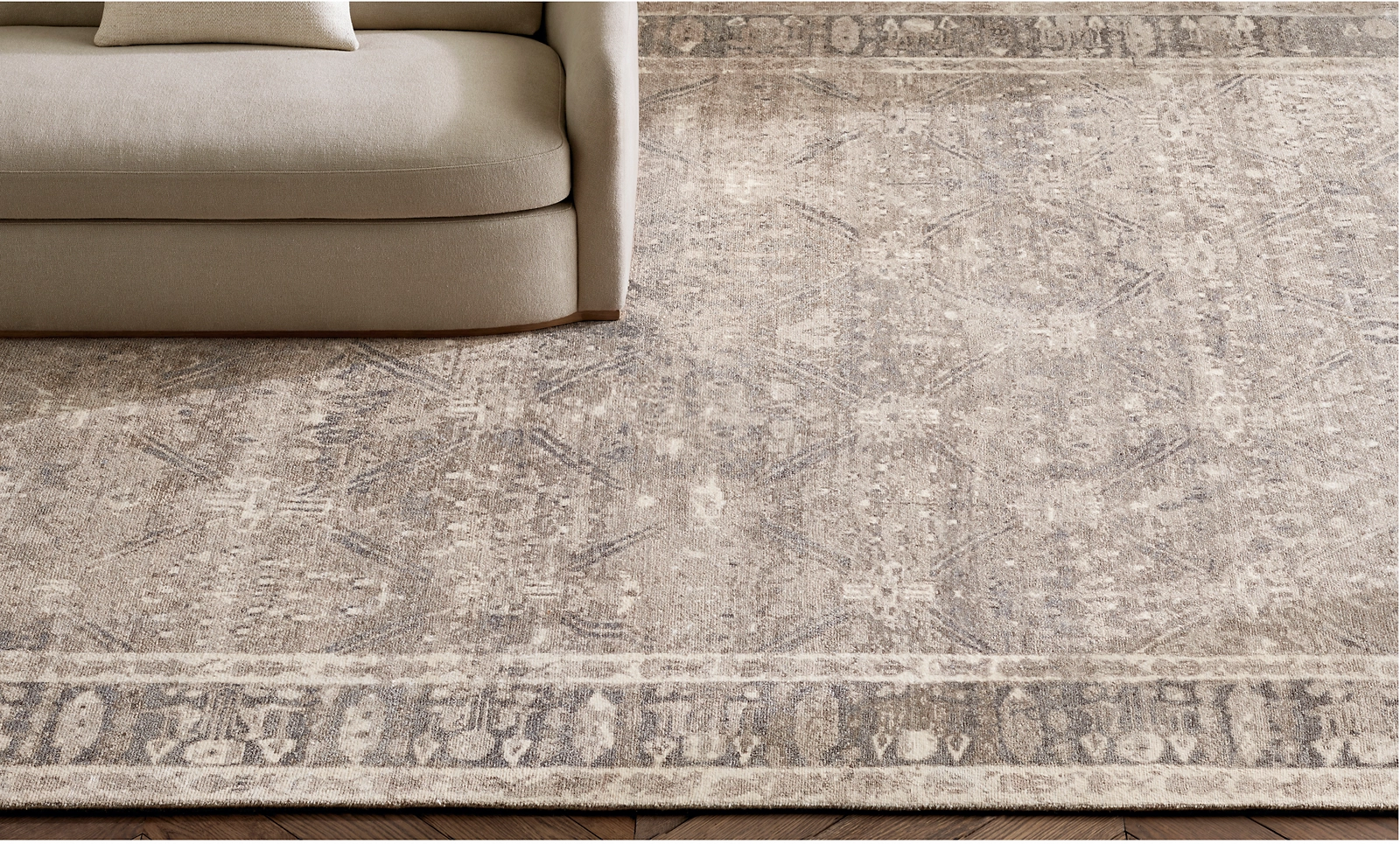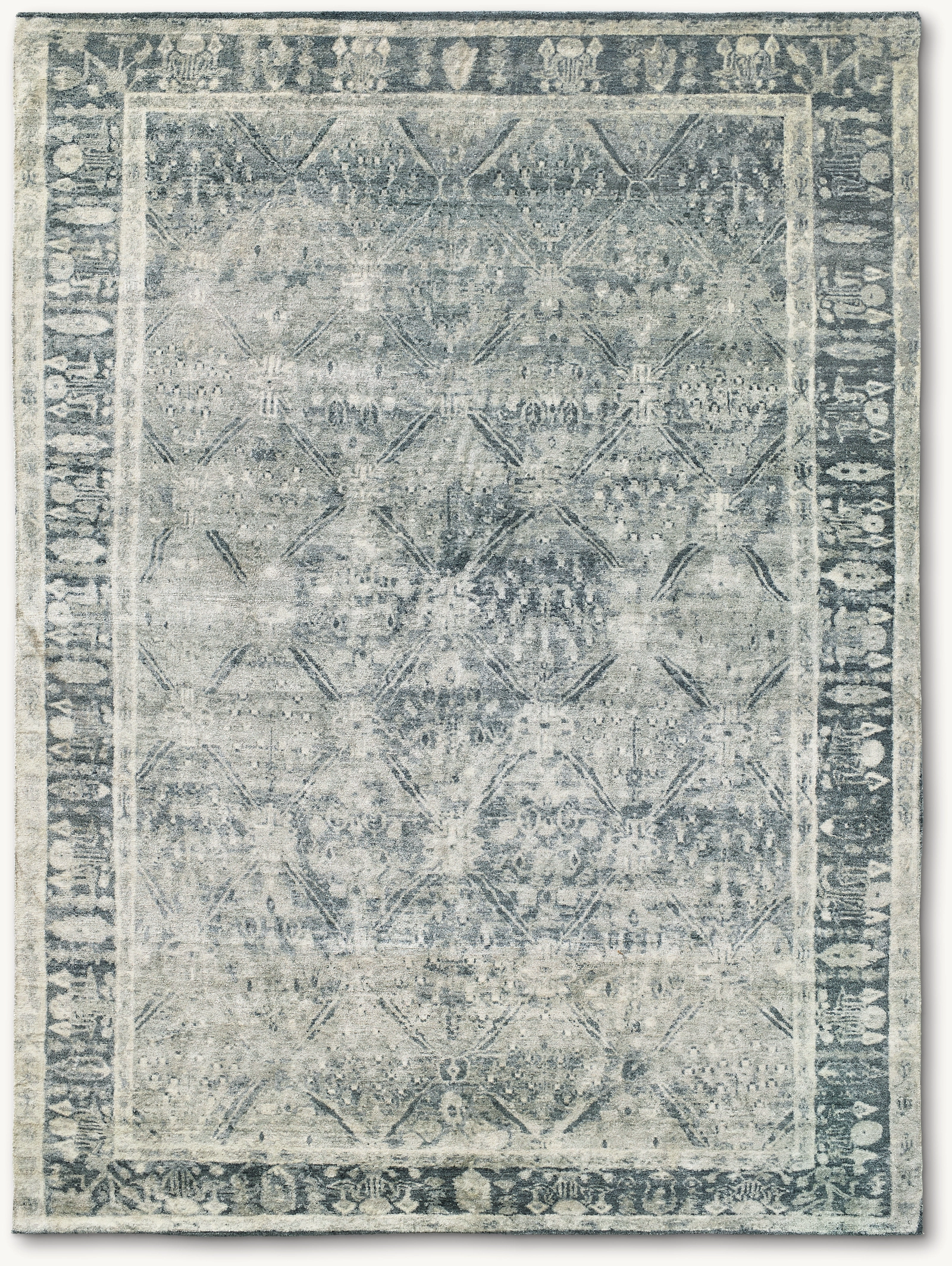 In a modern revival of 19th-century Persian motifs, our Taj rug's abstract botanicals and trellised lines are both obscured and emphasized by the rug's monochrome palette. Artisans hand spin the pure silk into organically textured yarns, which lend the hand-knotted pile a gossamer softness and warm, natural sheen.